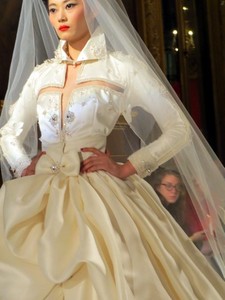 Défilé dans l’enceinte du prestigieux Palais Garnier car l’égérie du couturier est la danseuse étoile russe Irina Kolesnikova qui lui a inspiré pour la seconde fois une collection dans l’esprit des ballets russes. Du rouge, du jaune, du blanc et du bleu ciel, une magnifique et unique robe noire (« La Mariée était en noir », aussi…), un imprimé panthère sur mousseline turquoise pâle et le final avec « the » robe de mariée. Je ne vais pas me la jouer maîtresse Garance Doré en disant combien j’ai été « renversée » par tel petit plissé (j’adooore!) ou « interpellée » par un « twist » trop trendy afin de pimenter telle tenue (jargon des über-blogueuses mode twittant depuis le « front row » aux côtés du fantôme de Diana Wreeland). Mais j’ai passé un super-bon moment dans la magie des étoffes sculptées en robes de fées. Jean Doucet, spécialisé dans la Haute Couture, formé par Dior et Patou, passionné de voyages lointains, où il puise son inspiration dans les traditions ancestrales d’Asie et d’Afrique, a eu également l’idée de lancer son champagne : on a pu tester le breuvage au cocktail qui a suivi le défilé.