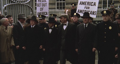 Sur la photo ci-dessus, la scène se passe au commissariat où on demande à Sacco et Vanzetti de lever la main comme s’ils étaient en train de tirer… Puisqu’on les accuse du hold-up d’une manufacture de chaussures, un braquage qui a mal tourné, deux employés sont morts. Pourtant, Nicola Sacco, cordonnier, et Bartolomeo Vanzetti, poissonnier, ne sont pas des assassins mais de modestes immigrés italiens venus tenter leur chance en Amérique, le premier mutique, le second se déclarant anarchiste et fier de l’être. Mais, comme le montre très intelligemment la première scène du film (le spectateur se demande de quoi il s’agit, les policiers cassent les vitres des maisons, cognent les gens, les regroupent, les font partir en pleine nuit… dans quel pays et à quelle époque est-on?), les raffles d’immigrés, extrêmement violentes, n’ont pas bonne presse en Amérique. Aussi, en 1920, le ministre de la justice, un certain Palmer (les « raffles Palmer »), bien avant Mc Carthy, obsédé par la traque des « rouges » (bolchéviques) et des « anars », a préféré mettre en scène ce procès truqué de deux immigrés italiens accusés sans preuves tangibles d’avoir commis un braquage ; accusés en vrai d’être anarchistes et immigrés de nationalité italienne. Le procès de Sacco et Vanzetti va durer 7 ans, en 1927, ils seront exécutés sur la chaise électrique de l’état du Massachussets malgré qu’un des types de la bande de Morelli, auteurs du hold-up, ait avoué leur crime en prison.